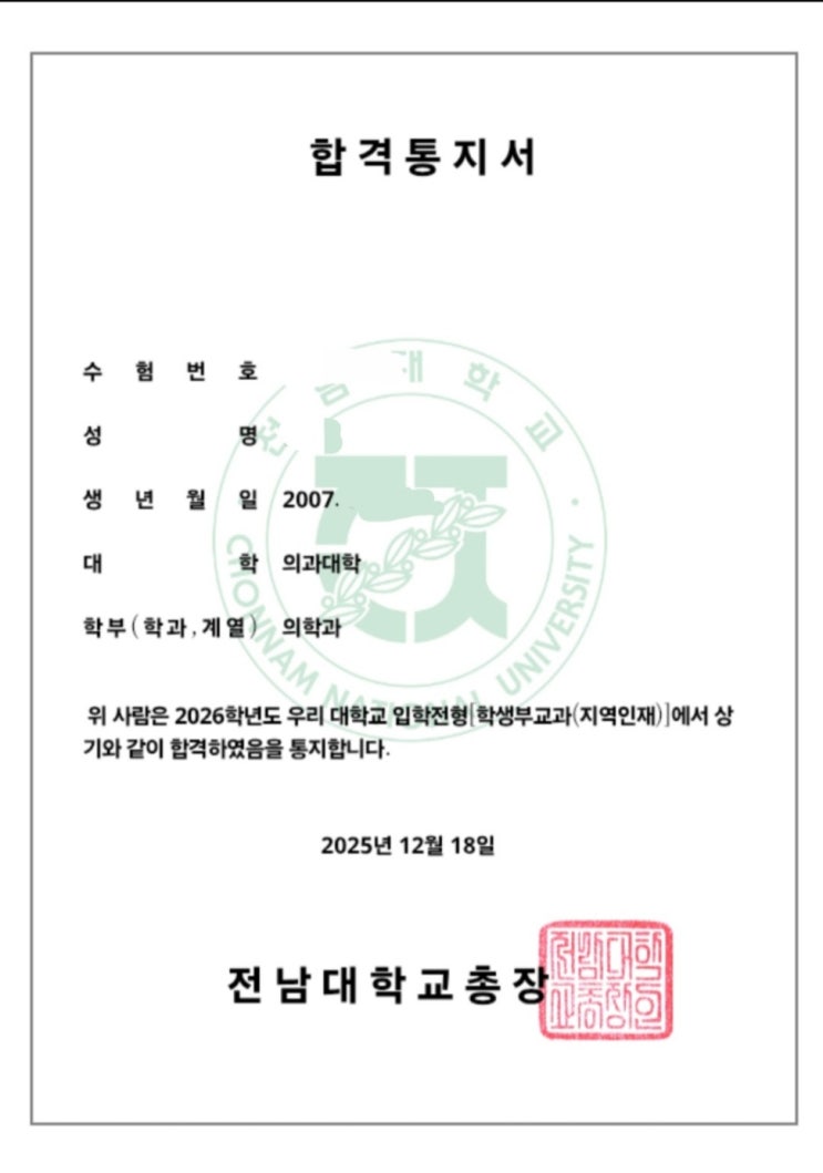 2026학년도 양현고3 재학생 전북대 의예과 합격