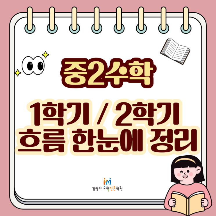 중2수학은 식, 함수, 도형, 확률이 한 학년 안에서 이어집니다. 단원만 외우기보다 연결되는 순서를 먼저 정리하면 학습 계획이 단순해집니다. 안녕하세요. 진짜 수학 실력을 만드는 김영미수학학원입니다. 2022 개정 교육과정은 2024년부터 2027년까지 단계적으로 적용됩니다. 이 과정에서 중2수학은 수와 식, 함수, 기하, 확률과 통계의 큰 축으로 정리해두는 게 좋습니다. 특히 도형 영역은 성질을 설명하는 과정이 중요해지고, 용어와 표현도 더 꼼꼼히 다루는 편이 좋습니다. 아래는 중2수학을 1학기와 2학기로 나눠 핵심을 정리한 내용입니다. 1. 중2수학의 큰 지도, 1학기와 2학기를 먼저 나눠보면 쉬워집니다. 중2수학은 단원이 서로 섞....... <img src="https://blogthumb.pstatic.net/MjAyNjAyMjhfMjYy/MDAxNzcyMjg0MTkwMDEy.XNUzGaveRE7MGgY0VVReGVgtOA60ekbTdKYaDsEctNog.-V7Up6bNQJ-qZE4C_2RMT9-eOHVpD9NmcqY80jwfJ-cg.PNG/%C1%DF2_%BC%F6%C7%D0_%BD%E6%B3%D7%C0%CF.png?type=s3" />