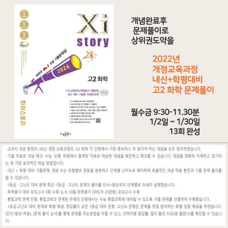 예비고2 [ 일반선택과목 방학특강 ] 엔픽화학+생명도 정원마감 하였습니다 ! 엔픽 물리만 등록가능합니다 엔픽시리즈 마감되면서 자이스토리 화학 오늘저녁 개강확정되어 광고합니다 화학 개념완료 학생에 한해 개념보다는 문제적용능력을 끌어내는데 안성맞춤인 자이스토리 고2 화학으로 개념보다는 문제풀이가 필요한 학생에게 적합합니다 예비고1~예비고2 대상으로 진행하겠습니다 #수능기출#고등화학#학평대비#내신기출#청운고화학#해운대고화학#부일고화학#센텀고화학#해강고화학# #충렬고화학#해운대화학#센텀화학#화학1#수능기출화학#과탐화학#덕문여고화학#남일고화학#수능기출화학# <img src="https://blogthumb.pstatic.net/MjAyNTEyMjBfMjM0/MDAxNzY2MjM4NTQ0NTE0.dTkTTseTIl2y7xzqEVA1Ic5cwMKz-DzPhwYeUG3jN9Ag.iL9Ix0JDdsnvXIbSy9PrRc-AFJEXhyrPukWBz89WNiwg.JPEG/%C1%A6%B8%F1%C0%BB-%C0%D4%B7%C2%C7%D8%C1%D6%BC%BC%BF%E4_-001_-_2025-12-20T224126.807.jpg?type=s3" />