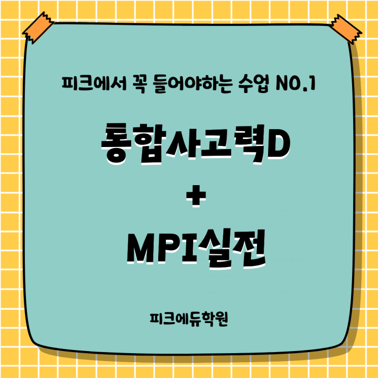 2026 통합사고력D+MPI실전 사고력반 3월반 모집 (황소대비 필수과정) 안녕하세요~ 일프로샘입니다^^ 오늘은 3월 시작하는 피크의 사고력반들을 안내해 드리려고 합니다. 일명 전통의 매쓰피크 황소대비반!! 통합사고력D와 MPI실전 3월 시작반입니다. 통합사고력D는 시중 사고력 교재 초급/중급내용 중 초3까지의 수 범위를 활용한(황소 정규 사고력 입학시험 범위) 29개 주제를 공부하는 피크의 시그니쳐교재로 진행되는 과정입니다. 제가 20년 이상 아이들과 사고력 공부를 하면서 가장 효율적이었던 학습방법을 고려하며 제작한 교재에요. 사고력 수학은 혼자 생각하면서 풀어내야 제대로다? 이말은 맞기도 하지만 틀리기도 해요. 저는 우....... <img src="https://blogthumb.pstatic.net/MjAyNjAyMjRfMTYy/MDAxNzcxOTE0NTI0MzU0.5QYOGZ1s0QwAR0glOCr-Pq2Y5ITBQ-i1dvlQZVjyqV4g.Uo7hfUZXQ7AY35NTLptkXwyPWYHgdl-O40HOHoUbfugg.PNG/%C1%A6%B8%F1%C0%BB_%C0%D4%B7%C2%C7%D8%C1%D6%BC%BC%BF%E4._%2827%29.png?type=s3" />