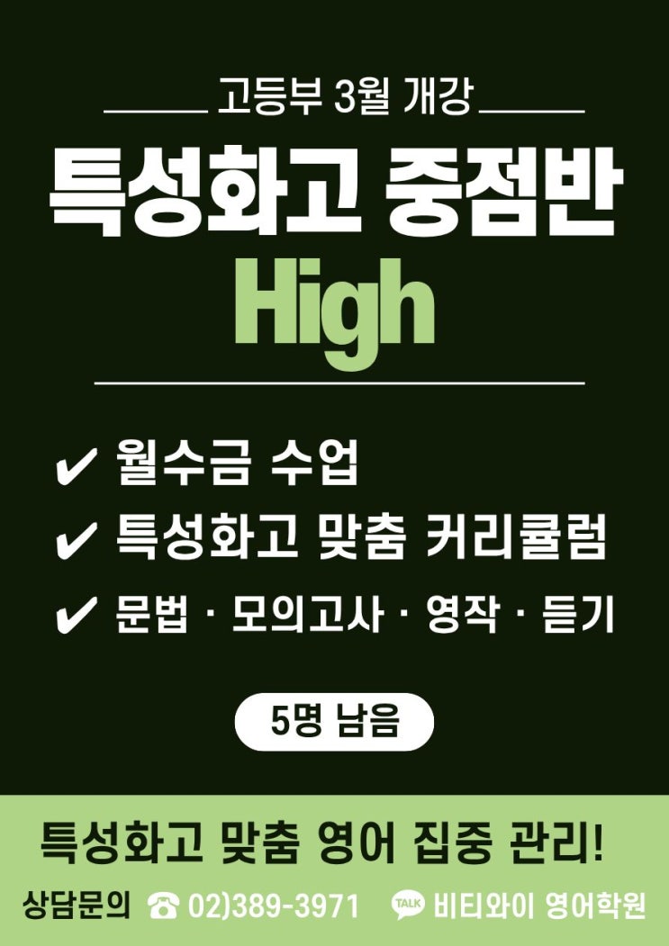 [비티와이 영어학원] 3월 개강 특성화고 중점 High반 모집 안내
