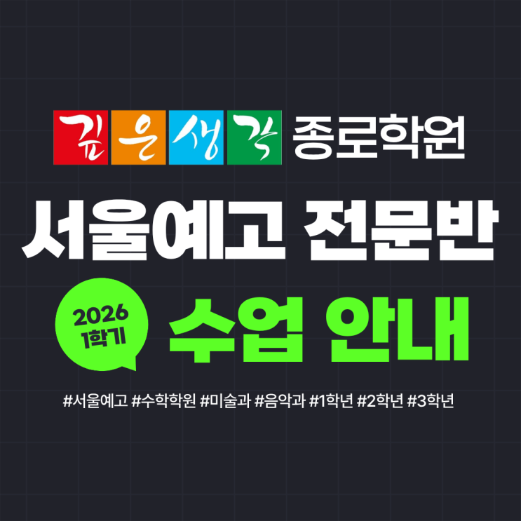 안녕하세요. 깊은생각 종로학원입니다. 2026년 새학기를 맞이하여 저희 학원에서는 '서울예고 전문반' 수업을 개편 및 개강할 예정입니다! 서울예고 전문반은 어떻게 수업을 하는지? 저희 학원만의 방식을 소개드리겠습니다 :) 서울예고 수업 구분 서울예고에서는 전공별 수학 과정이 조금씩 다르게 진행되고 있습니다. 같은 수학이라도 배우는 내용이나 시험 범위 등이 구분되어 진행되기 때문에 학원에서도 따로 구분하여 수업이 진행되어야 합니다. 전체적으로 배우는 내용은 비슷할지라도 각자에게 더 중요하고 필요한 부분이 다르기 때문이죠. 그래서 저희 학원에서도 '학년별' 구분 뿐 아니라 '전공별'로 미....... <img src="https://blogthumb.pstatic.net/MjAyNjAyMjNfMTA1/MDAxNzcxODE3MTc3NTAx.0vTKPpAAbYRpt794TPSKIY3bQepMbmk1p0AWViJID8Ig.WgwkGdw6691LbZpWrHKC0QX3aiJY4kELJQ6K6mhQuhgg.PNG/1.png?type=s3" />