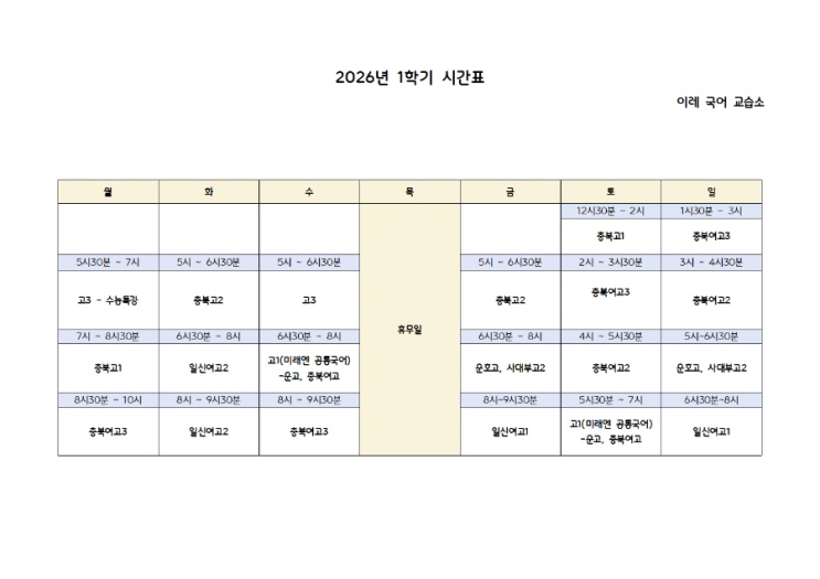 3월 3주부터 내신 대비 수업을 진행합니다. 시간표 확인하시어 착오 없으시길 바랍니다. ^^ <img src="https://blogthumb.pstatic.net/MjAyNjAyMTFfMjM1/MDAxNzcwODA1OTQ4MDE1.DTmkkGS1PD4JkTJLI6HQfxmMiz04mk7SKnHgeis7c9og.IAPX29h83ipZ87rE7Oao77-7Z1Q5ZKJzpeGun4Ou-1Qg.PNG/900%A3%DF1770805125780.png?type=s3" />