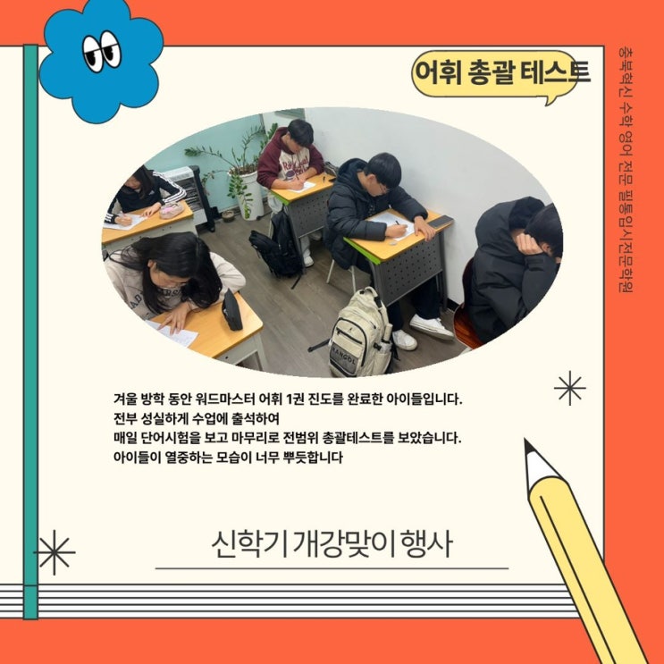 안녕하세요 필통입시전문학원입니다. 겨울방학이 끝나고 다시 봄이 오네요. 충북혁신도시 관리형 학원 충북혁신도시 영어 수학 입시전문 학원은 필통입시전문학원입니다. 우리아이들 방학 때 잘 쉬는 것도 중요하고 신학기 공부를 수월하게 하기 위해서 학습내용을 준비하는 것도 중요하겠죠. 그중에 한 순간을 공유해보려합니다. 겨울방학 종강기념 단어총괄테스트입니다. <img src="https://blogthumb.pstatic.net/MjAyNjAyMjhfMzEg/MDAxNzcyMjQzODg0MTE2.wz2qDFLnkaTy6f-d5M3w3VwTtAozk7KH4LrJOaE7ri0g.JnyNnGutPLgjsfn6g2M0ETUGN3ZCV9ELXOjfKZSletIg.JPEG/IMG%A3%DF7511.JPG?type=s3" />