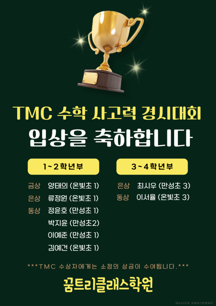 꿈트리 친구들, 멋진 첫 도전! 지난 11월 1일, 제 13회 전라북도 스도쿠 퍼즐대회 2교시에 씽크 아카데미가 주최한 초등부 대상 TMC 수학 사고력 경시대회 열렸습니다. 10월에 결정이 되다보니, 특별히 이번에는 전라북도 스도쿠 퍼즐대회 선수들은 별도의 응시료 없이 대회에 참여할 수 있는 기회가 제공되었어요. 감사합니다. 꿈씨들, 평소 실력으로 당당히 도전! 꿈트리에서는 놀이수학, 창의퍼즐 포텐 사고력 수학, 팩토 사고력수학 수업을 진행하고 있기에 이번 대회에는 평상시 실력 그대로 참가하기로 했어요. 1교시 스도쿠 대회를 마무리하고 조금 지친 친구들도 있었지만, 10분의 휴식 후 2교시 사고력 경시대회 시작! 울 꿈씨들은 수학....... <img src="https://blogthumb.pstatic.net/MjAyNTEyMDJfMjE2/MDAxNzY0NjQxMzA0MzU5.qeJAa8MHKfWBexrm6eXurHZWPq3MC0LjlJksDlNZiGcg.dqYWTFn30JtYb9AKZCoPKbMd57SSwn9Pj8p4C8un258g.PNG/%C1%A6%B8%F1%C0%BB_%C0%D4%B7%C2%C7%D8%C1%D6%BC%BC%BF%E4..png?type=s3" />