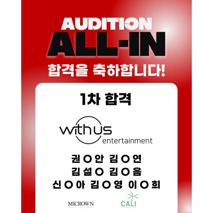 안녕하세요 #전주실용음악학원 마이크라운뮤직아카데미 입니다! 지난 11월 8일 진행된 ALL-IN 연합 오디션이 성황리에 종료되었습니다. 종료된 이후 꾸준히 합격 소식이 들려오고 있습니다! 이번 연합오디션을 통해 권0안, 김0연, 김설0, 김0음, 신0아, 김0영, 이0희 학생이 #위드어스엔터테인먼트 에 1차 합격하였습니다! 축하합니다 #마이크라운뮤직아카데미 오디션반은 지속적인 내방오디션, 연합오디션, 영상오디션 등 으로 아이돌, 가수를 지망하는 학생들에게 오디션 기회를 제공하고 있습니다. [문의 및 상담 예약] 마이크라운뮤직아카데미 전북 전주시 완산구 유연로 294, 3층 운영시간 : 월~토 13:....... <img src="https://blogthumb.pstatic.net/MjAyNTEyMDhfMTYy/MDAxNzY1MTc0NTY3MDE0.zsIBSMyX4HYDIxeJ0e4O3wJIXVcT9VjOuR9xwbMDiqwg.E99K3Ap4QxnUJ170ZcIa2AyQVcgO6W5d5AhFJpV3e9Ag.JPEG/ISIMG-1095763.JPG?type=s3" />