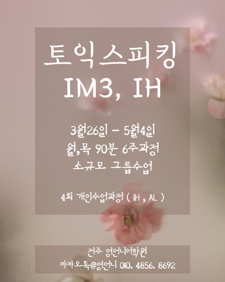 안녕하세요. 영언니 어학원입니다. 4월 토익스피킹 강의안내입니다. 현재 3월 한달 휴강중이니 상담문의 시 참고해주세요! 휴강기간 상담안내 카카오톡 / 문자 상담 3월 9일 이후 전화 및 방문 상담 3월 16일 이후 (방문 상담은 예약 후⠀진행) ▼휴강안내글 보러가▼ 4월 토익스피킹 강의안내 토익스피킹 IM3/IH 소규모 그룹 / 4회단기 일대일 토스 그룹수업 주2회 6주 과정 월/목 저녁 7시 (90분수업) 3월26일 개강 → 5월4일 종강 430,000 IM시리즈 보유자는 4주차 부터 수강가능 (상담 후 결정해주세요) 영언니 어학원의 대표강의입니다. 오랜경력으로 탄탄하게 쌓아온 노하우를 모두 드립니다. ▼토익스피킹 수업안내 및 후기▼ 4회 일대일....... <img src="https://blogthumb.pstatic.net/MjAyNjAzMDlfMjcx/MDAxNzczMDYwNDU4OTQ3.W4j_r_cDKIBYPn3XHPJf1JowDZsADUKs2b6xQcCEG5Ag.fdm_BNHRBpdP5VlWE5Yv_t5_wbkLUH1kiMUdZSxuvRMg.PNG/4%BF%F9%C5%E4%BD%BA.png?type=s3" />