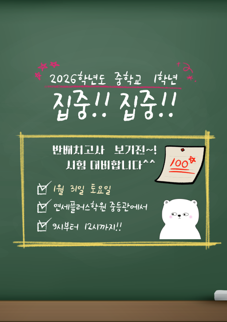 안녕하세요^^ 연세플러스학원입니다. 중학교에 올라간다는 것은 아이들에게 생각보다 큰 변화입니다. 과목이 늘어나고, 시험 방식이 달라지고, 처음 접하는 OMR 카드와 반배치고사까지. “공부” 이전에 시험이라는 환경 자체가 낯설 수밖에 없습니다. 그래서 연세플러스학원에서는 중등으로 가는 친구들을 응원하는 마음으로 학원에서 ‘첫 시험 경험’을 미리 해보는 자리를 준비했습니다. 영어·수학만이 아닌, 전 과목!! 이번 시험은 ✔ 영어 ✔ 수학 뿐만 아니라 ✔ 국어 · 사회 · 과학까지 함께 진행합니다. 중학교 시험은 단순히 한두 과목을 잘 보는 것이 아니라, 여러 과목을 집중력 있게 연속으로 치르는 힘도 중요하기 때문입니다. 아....... <img src="https://blogthumb.pstatic.net/MjAyNjAxMjBfMjQ3/MDAxNzY4OTA1Nzg1NTg0._xGDGGXG9yOUZXfzNj4UPPMu_zSU17Xj5wKtvd4Y2bAg.ArF3kg9dNBvsPfuFJnoMVyf-o7ukEbln0DRspk4Gvjkg.PNG/%C1%A6%B8%F1%C0%BB_%C0%D4%B7%C2%C7%D8%C1%D6%BC%BC%BF%E4._%2821%29.png?type=s3" />