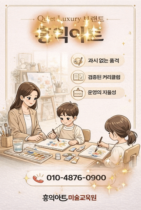 요즘 소비 트렌드는 분명히 달라졌습니다. 과거에는 로고가 크고, 눈에 띄고, 한눈에 “비싸 보이는” 것이 중요했다면 지금은 다릅니다. 조용하고, 절제되어 있고, 아는 사람만 아는 가치. 이것이 바로 Quiet Luxury의 시대입니다. 그리고 저는 이 흐름이 홍익아트 미술교육원의 구조와 닮아 있다고 생각합니다. 상담문의 홍익아트 경기남본부 010-4876-0900 1️⃣ 프랜차이즈지만, 통제하지 않습니다 많은 사람들이 프랜차이즈를 떠올리면 이런 걱정을 합니다. 상호 강제 인테리어 통일 본사 제품 의무 사용 매출 압박 로열티 부담 본사 갑질 치킨, 제과제빵, 편의점 구조는 본사의 통제가 강한 시스템입니다. 하지만 홍익아트는 다릅니다....... <img src="https://blogthumb.pstatic.net/MjAyNjAyMjBfMjY3/MDAxNzcxNTgyMTQ0NTY5.dNRz2TWaxucPOrBz3Xk7eU79D1_IkKQ_YQnjjOR9CB0g.VJgf1LlpOIp2faUkDFvimgSW20bVOHHBbPcxLiDXTQAg.GIF/grok%A3%DFvideo%A3%DF2026%A3%AD02%A3%AD19%A3%AD00%A3%AD02%A3%AD36%A3%A81%A3%A9.gif?type=s3" />