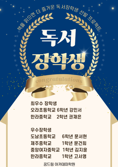 올해 꿈드림 아카데미에서는 두 개의 프로젝트를 연이어 진행했습니다. 그 첫 번째는 바로 독서장학생 선발 프로젝트입니다. 겨울 동안 학생들이 꾸준히 책을 읽고 독서감상문을 작성하는 프로그램으로, 초등부는 일주일에 한 권, 중등부는 2주일에 한 권 읽기를 목표로 운영하였습니다. 단순히 책을 읽는 것에 그치지 않고, 자신의 생각을 글로 정리하는 힘을 기르는 데에 중점을 두었습니다. 평가는 ✔ 얼마나 꾸준히 책을 읽었는지 ✔ 독서감상문의 내용과 깊이 ✔ 글의 분량과 글씨체 이런 평가항목을 바탕으로 심사를 하였습니다. 그 결과, 노력을 보여준 학생들 가운데 최우수 장학생과 우수 장학생을 선발하게 되었습니다. 이번 프로젝트....... <img src="https://blogthumb.pstatic.net/MjAyNjAzMjdfMjM0/MDAxNzc0NjIxOTU5MTU5.WRb-WUwlW0KxvjTupHesQ1n7pecK2KYG1XpCrpYMjtYg.rEDTyBLFLYoYCQkrN6gocGwULoEvhTf5m-a_apGhtMcg.PNG/image.png?type=s3" />