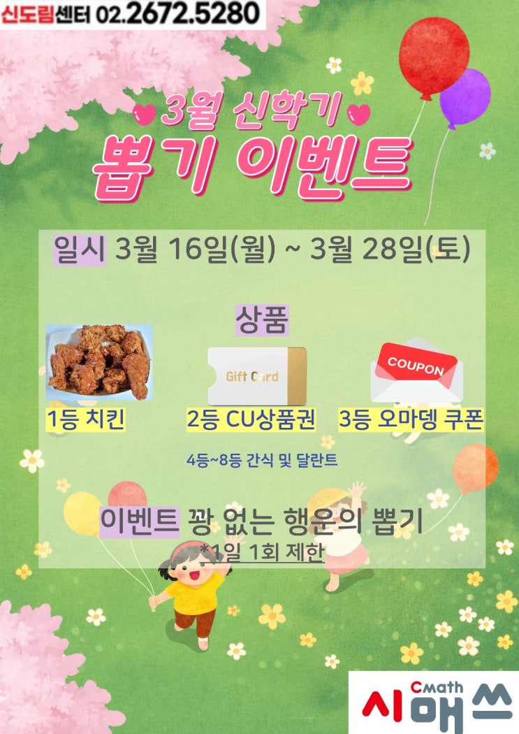 3월 신학기 뽑기 이벤트 안내 안녕하세요! 신학기를 맞아 씨매쓰 신도림센터에서 즐거운 이벤트를 준비했습니다. 새 학기의 설렘을 담아 “꽝 없는 행운의 뽑기 이벤트”를 진행합니다! 공부도 하고 재미있는 선물도 받을 수 있는 기회이니 많은 참여 바랍니다. 이벤트 기간 3월 16일(월) ~ 3월 28일(토) 이벤트 상품 행운의 뽑기를 통해 다양한 선물을 받을 수 있어요! 1등: 치킨 2등: CU 상품권 3등: 오마뎅 쿠폰 4등 ~ 8등: 간식 및 달란트 참여 방법 - 시매쓰 재원생이라면 누구나 행운의 뽑기 참여 가능 - 1일 1회 - 꽝이 없는 이벤트라서 누구나 선물을 받을 수 있습니다! 따뜻한....... <img src="https://blogthumb.pstatic.net/MjAyNjAzMTFfNDMg/MDAxNzczMjIxMjE2ODIy.i8UhhNUOtuxdraUUStLRIKS1GAYyJxUtVMzu7OawB-8g.aKOmQ5UpoIz_HejS-g4SqjLjY9vKFJC2c83aH21pbS4g.JPEG/%C1%A6%B8%F1%C0%BB_%C0%D4%B7%C2%C7%D8%C1%D6%BC%BC%BF%E4._%2821%29.jpg?type=s3" />