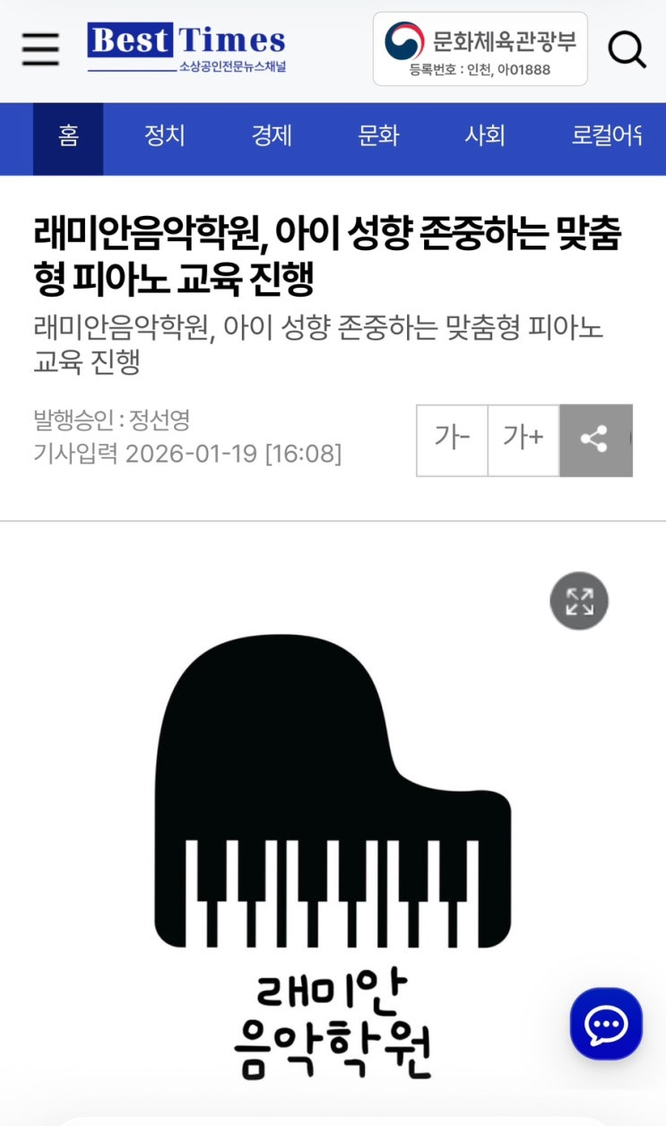 래미안음악학원, 언론에 소개되었습니다 안녕하세요, 래미안음악학원입니다 최근 저희 학원이 온라인 매체 BestTimes에 소개되었습니다. 아이의 성향을 존중하는 맞춤형 피아노 교육에 대한 이야기를 담아주셨습니다. ⸻ 아이마다 다른 속도, 다른 음악 피아노는 단순히 곡을 완성하는 교육이 아니라 아이의 성향과 호흡을 함께 맞춰가는 과정이라고 생각합니다. 누군가는 빠르게, 누군가는 천천히. 래미안음악학원은 아이 한 명, 한 명의 속도를 존중하며 기초부터 탄탄하게 지도하고 있습니다. ⸻ 기초부터 자신감까지 ✔️ 체계적인 기초 이론 수업 ✔️ 개별 성향을 고려한 1:1 맞춤 지도 ✔️ 연주를 통한 표현력 향상....... <img src="https://blogthumb.pstatic.net/MjAyNjAyMjRfNTIg/MDAxNzcxOTE1MjM5NjAy.TV7ilw7vI0U320FQWxpU2vA_LgyxyEJyQ5X9rvLiBg8g.03FH-IpqG7aC-UpolGpRTlZSVqWfK6H3u2Fwva3u_yEg.JPEG/IMG%A3%DF6603.jpg?type=s3" />