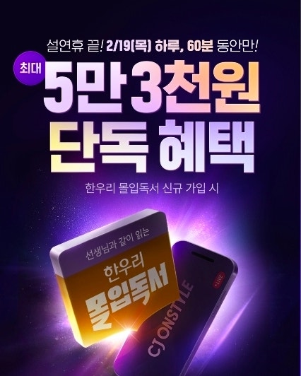 CJ와 함께 하는 마지막 타임어택 2월 19일 목요일 오전 10시 혼자 읽게 하지 마세요. 제대로 읽기로 자신감을 갖게 해 주세요. 달라진 우리 아이 모습 바로 확인할 수 있습니다. 어떻게 신청하나요? 1. 10시 CJ온스타일 상담신청한다. 2. 3월까지 회원신청을 한다. 3. 53,000원 혜택을 받는다. <img src="https://blogthumb.pstatic.net/MjAyNjAyMTNfMjk4/MDAxNzcwOTgzNjM3ODk2.G77xrVKni_TgxAWKHP7V0cOP7tAgQnfUzrvwJKFoFbog.E0HNvOcX3ErYou9M3Dr1Ww7k9wt40isQB-8RO4z_ymwg.JPEG/1770983583762.jpg?type=s3" />