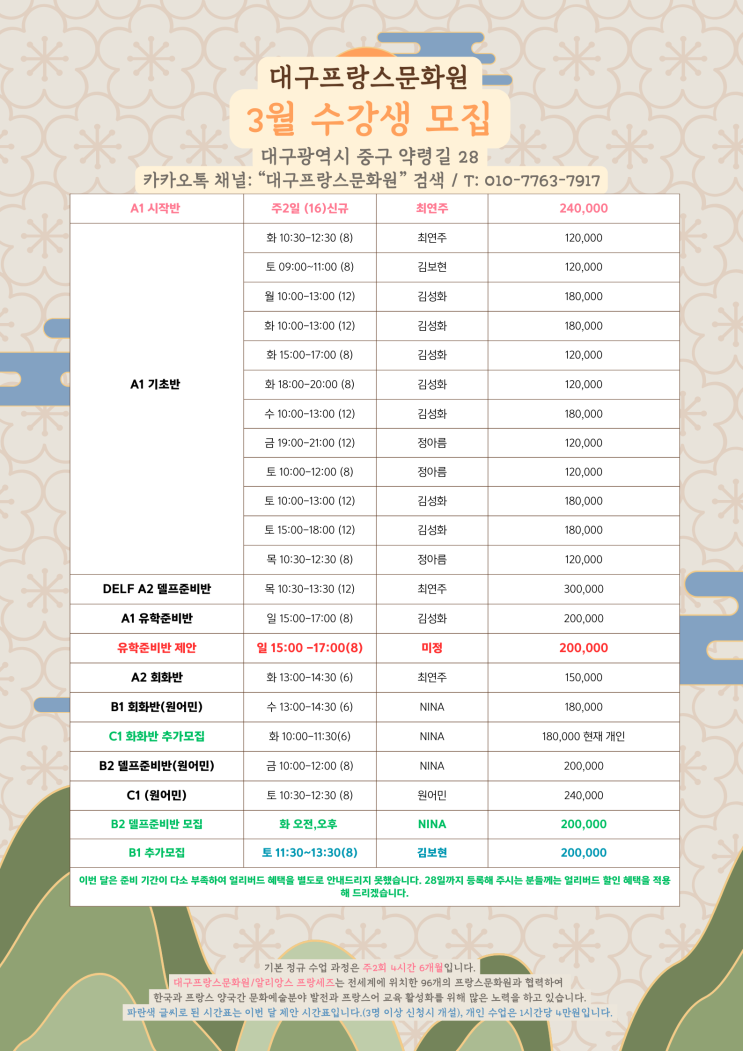 3월 프랑스어 수강생 모집 안내 안녕하세요 3월 정규반 & 델프 준비반 수강생을 모집합니다! ️ 토요일 정규반 A0 입문반 김보현 ⏰ 10:00 ~ 12:00 A0 델프 주니어 준비반 (온라인) 송상아 ⏰ 10:00 ~ 12:00 B1 중급반 김보현 ⏰ 12:30 ~ 14:30 C1 말하기 (원어민 수업) ⏰ 10:30 ~ 12:00 ️ 평일반 모집 30분 온라인 수업 월,수/화, 목요일 ⏰ 07:00~ 07:30 A0 ~ B1 수준 모집 중 저녁반도 함께 모집합니다. 9시~9시30분 델프 준비반 안내 기존 DELF 준비반 A2, B1 수강생분들도 적극 참여하셔서 3월 DELF 시험에서 좋은 결과 얻으시기 바랍니다 ✨ 프랑스어를 처음 시작하시....... <img src="https://blogthumb.pstatic.net/MjAyNjAyMjRfMTAw/MDAxNzcxOTI3Mzk1MjYw.CngL1UQ4wGj3Rsv8ITXhZLhqtR2wAN2HVMM52UM6vH0g.l07SAJRsVupjmI1S-7gQe4z2jooeARZPsJUKIBv6tRIg.PNG/%B4%EB%B1%B8_%C7%C1%B6%FB%BD%BA%B9%AE%C8%AD%BF%F8_3%BF%F9_%BD%C3%B0%A3%C7%A5.png?type=s3" />