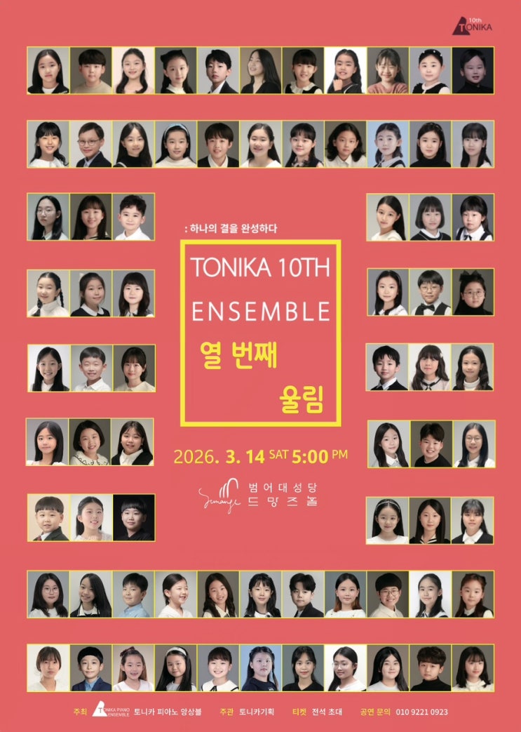 안녕하세요 ! 범어동피아노학원 범어동음악학원 채니음악학원 입니다! 신학기를 맞아 저희 채니음악학원에서 귀여운 친구들 5명이 토니카앙상블 정기 연주회에 출연 합니다! 토니카앙상블 정기 연주회는 제가 소속돼있는 앙상블 토니카에 학생들을 대상으로 하는 연주회로 올해 어느새 10회를 맞이하고 있습니다. 콩쿨과는 달리 성적보다는 연주 그 자체에 초점을 두고 연습을 진행하고, 중간에 연주를 중단하는 것 없이 끝까지 한 곡을 완주하게 됩니다. (콩쿨때마다 아쉬우셨던 학부모님들 많으셨을거에요저도 항상 우리 친구들이 준비한 전체 곡을 못 들려드려서 아쉬웠답니다.) 특히나 4핸즈, 8핸즈 같이 평소에 접할 수 없는 연주....... <img src="https://blogthumb.pstatic.net/MjAyNjAyMjRfMTM5/MDAxNzcxODk2Mjc0NzAw.vtZCWXkvrHN-XD-tO5sq-X6YWQF7hUaHX5PQkIDs3GMg.rHAAU2uRwY28oLoClMPsolven6nAtPWCh4ETSXhXGiIg.JPEG/IMG%A3%DF6216.jpg?type=s3" />