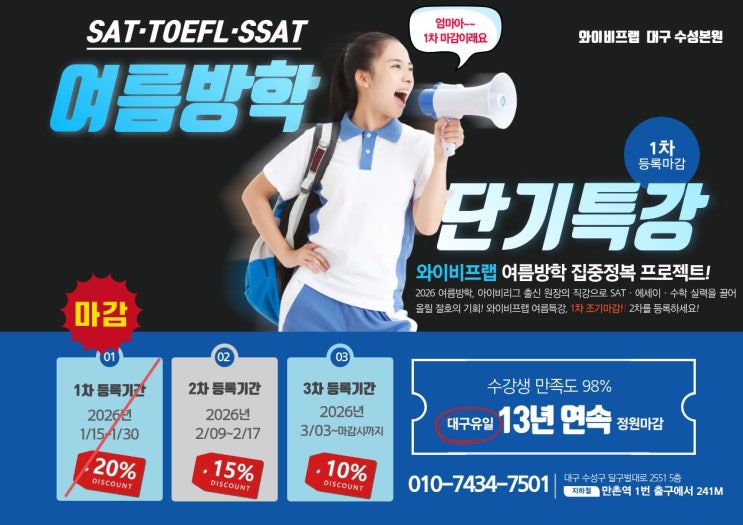 2026 여름특강 1차 등록, 조기마감! 1차 등록을 놓치셨다면 2차 등록!! 서두르세요!!! 2차 등록 15% 할인 망설이는 순간, 자리는 사라집니다. 누가 먼저 준비하느냐가 점수를 결정합니다! 올여름, 아이비리그 출신 원장의 직강으로 실력 폭발! 빠른 속도로 마감될 만큼 많은 관심과 신뢰를 보내주신 학부모님들과 학생 여러분께 깊이 감사드립니다. 여러분의 기대에 부응하기 위해 더욱 알찬 커리큘럼과 철저한 관리로 준비하겠습니다. YB Prep은 언제나 여러분의 성장과 도전을 진심으로 응원합니다. 2차 15%할인 안내 클릭 <img src="https://blogthumb.pstatic.net/MjAyNjAyMTNfMjI2/MDAxNzcwOTU1MDQ2NzA4.l8XwSF8MStZJBz1sA5L2wcqjeTThtsrH0IjnDtepeGMg.FA95c_vmFf9uTmT7Eej3GM1ccFieUlbDZVxb1CPhNUQg.JPEG/2026%B4%EB%B1%B8SAT%BF%A9%B8%A7%B9%E6%C7%D0%C6%AF%B0%AD1%C2%F7%B8%B6%B0%A8%C6%F7%BD%BA%C5%CD.jpg?type=s3" />