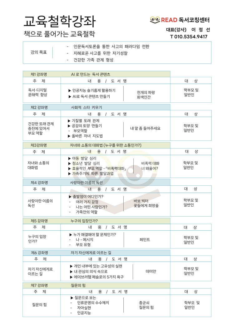1. 부모의 철학이 아이의 미래를 결정합니다 AI가 일상이 된 시대, 우리 아이에게 진짜 필요한 교육은 무엇일까요? 기술보다 중요한 것은 현상을 바라보는 '관점'과 '철학'입니다. READ 독서코칭센터가 제안하는 책으로 풀어가는 교육철학 강좌를 통해 부모와 자녀가 함께 성장하는 시간을 마련했습니다. 2. 강의 목표: 우리가 함께 도달할 지점 단순한 지식 전달을 넘어, 삶의 태도를 바꾸는 세 가지 목표를 지향합니다. 인문독서토론을 통한 사고의 패러다임 전환 지혜로운 사고를 위한 자기성찰 소통과 공감을 통한 건강한 가족 관계 형성 4. 이 강의만의 특별한 점 검증된 도서 리스트: 각 주제에 딱 맞는 선정 도서를 통....... <img src="https://blogthumb.pstatic.net/MjAyNjAyMjNfMjI3/MDAxNzcxODM3MDgzNjU0.wGugJwLQabqicA_ll2LPw2DGM8AGu13EJVhu1i8h1hwg.XFP1j_bKfsspeoLd0fHDZ9HlvE7NU3Uo57GdL9U9COMg.JPEG/%B1%B3%C0%B0%C3%B6%C7%D0-%B0%F8%C5%EB.jpg?type=s3" />