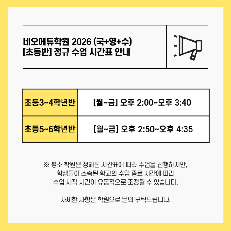어느덧 겨울방학 특강도 후반에 접어 들었네요! 3월부터 시작하는 1학기 시간표를 안내드립니다. 보다 자세한 사항은 학원(747-1737)으로 문의주세요^^ <img src="https://blogthumb.pstatic.net/MjAyNjAyMTFfOTkg/MDAxNzcwNzc1ODI4ODg4.WYi4u9KO3WGkQC2H2_wz4tBnkAUlXjWOxa0kJ0ffCLkg.Vh2xHEEW90xm81jKuYZkTKTXz2HxhBJ9TfThKQrCOdcg.JPEG/2026%B3%E2%B5%B5_1%C7%D0%B1%E2_1001.jpg?type=s3" />
