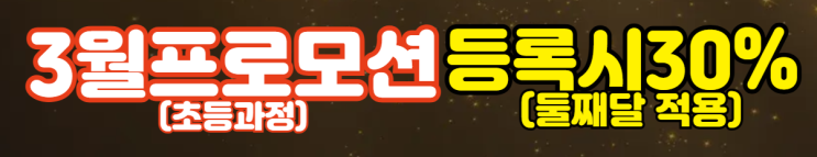 3월 프로모션(초등) : 등록시 30%(둘째달 적용) 3월 신학기 화이팅^^ 신학기 대비 3월 프로모션 안내해 드려요 ˇ∪ˇ ▶ 3월 프로모션 : 등록시30%(둘째달 적용) ▶ 적용시기 : 현재부터~3월까지 ▶초등1~3학년 파닉스반 모집 ▶ 초등 1~3학년, 고학년, 중등 수학반 모집 AI-QV 파닉스 3 Levels 초등1학년~3학년까지 아이들의 파닉스과정이예요. 파닉스는 아이들이 쓰기와 읽기를 처음으로 마주하게 되는 과정이기 때문에 개인의 성향과 능력에 맞게 커리큘럼을 개별 설정해야만 하죠~~ 속도 조절도 중요합니다. 예비초등과정인 Hello Phonics와 고학년과정인 Master Phonics과정이 별도로 있기때문에 학년별 세분화 파닉스 진행이 가능하답니다....... <img src="https://blogthumb.pstatic.net/MjAyNjAyMjJfNDAg/MDAxNzcxNzU3MTQxOTIy.rFzzqbcDHomrq4y0e2nzalttNibr5V6QLKxvH7JFg0og.FDZhUTqHoFXyu4FqSzxyqJExdycP5bOXMXrX8hzCfy4g.PNG/20260222_194530.png?type=s3" />