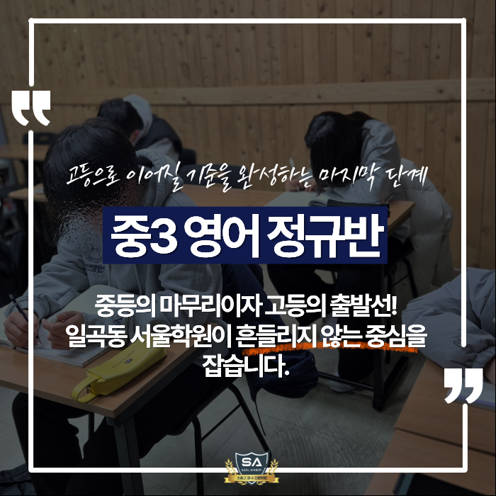 안녕하세요. 일곡동영어학원 서울학원입니다. 일곡동중등영어 서울학원은 전교 1등 다수 배출, 서울대·연세대·고려대 등 상위권 대학 진학 성과를 통해 중등에서 세운 기준이 고등까지 이어진다는 것을 결과로 증명해온 학원입니다. 이 성과의 흐름을 보면 분명합니다. 고3에서 갑자기 실력이 뛰어오른 경우는 드뭅니다. 대부분의 학생들은 중3에서 영어의 구조를 완성한 뒤 고등으로 올라갔습니다. 중3 영어는 중등 내신의 마무리이자 고등 영어의 출발선입니다. 이 시기에 문법과 구문이 정리되지 않으면 고1에서 영어는 곧바로 “해석이 안 되는 과목”이 됩니다. 그래서 서울학원 중3 영어 정규반은 중등 성적 관리에만 머무르지 않고, 고등....... <img src="https://blogthumb.pstatic.net/MjAyNjAyMjRfMjE1/MDAxNzcxOTIwNDY5ODIy.O81Nqq42gp0KWh9e0RNpiwUKoD9FX2uaki1LESuoHasg.R0AGnwFss1KL0l3ADXxj3YQBrTu6OB0bouRsGp9pofYg.PNG/1.png?type=s3" />