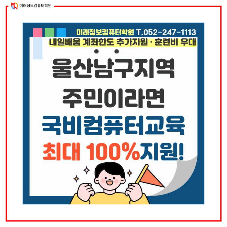 안녕하세요! 미래정보컴퓨터학원입니다 울산 남구 주민 여러분, 혹은 남구 소재 사업장에서 근무하셨던 분들! ♀️ 지금이 바로 스펙 업그레이드할 최고의 기회라는 사실, 알고 계셨나요? 최근 고용노동부에서 울산 남구를 '고용위기 선제대응지역'으로 지정했습니다. 이로 인해 우리 학원의 인기 강의들을 훨씬 더 가벼운 마음으로 수강하실 수 있게 되었답니다. 울산 남구 고용위기 선제대응지역, 어떻게 활용할 수 있을까요? 이번 지정으로 인해 2026년 1월 12일부터 7월 11일까지 한시적으로 지원 혜택이 대폭 강화됩니다. •국민내일배움카드 혜택 UP 기존 5년간 300만 원 한도에서 200만원이 추가 지원되어 총 500....... <img src="https://blogthumb.pstatic.net/MjAyNjAyMjBfMTgy/MDAxNzcxNTY5NTY3NzMw.KOJAU8joEDbiMaeIRKnsMagohIVpo9qeMRdAwjkb2wwg.gQM7ULddRtpNiNEHnKKgQsdn4Gi_w7GGGseNuGkoMG4g.PNG/%B9%CC%B7%A1%C1%A4%BA%B8%C4%C4%C7%BB%C5%CD%C7%D0%BF%F8.png?type=s3" />