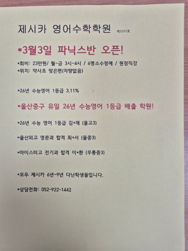 *제시카는 다릅니다! 파닉스반부터 단어암기 문장외워서 말하기 재미있게 지도 합니다. 그래서 기초를 튼튼하게 합니다. 파닉스~수능까지 쭉 다니는 학원! *26년 3월 3일 파닉스반 개강합니다! *회비 : 23만원 /월~금 3시~4시/ 6명정원/ 원장직강 *위치: 약사초 맞은편(차량없음) * 제시카 수능 1등급 친구들은 초등~고3까지 쭉 제시카와 함께한 친구들입니다. *위치 : 중구청, 약사초 맞은편 #파닉스 #약사초 #영어학원 #복산동 <img src="https://blogthumb.pstatic.net/MjAyNjAyMjFfMTM2/MDAxNzcxNjUwMjI4MzUz.USKfjYgnFj72YwkygZtjLeJS3Em16-lDxsxqHGi7A-Ug.VmbNncC4Iq0N81dWP09KUQbtobXbpoD1qILeUpEKwpUg.JPEG/900%A3%DF20260221%A3%DF134714.jpg?type=s3" />
