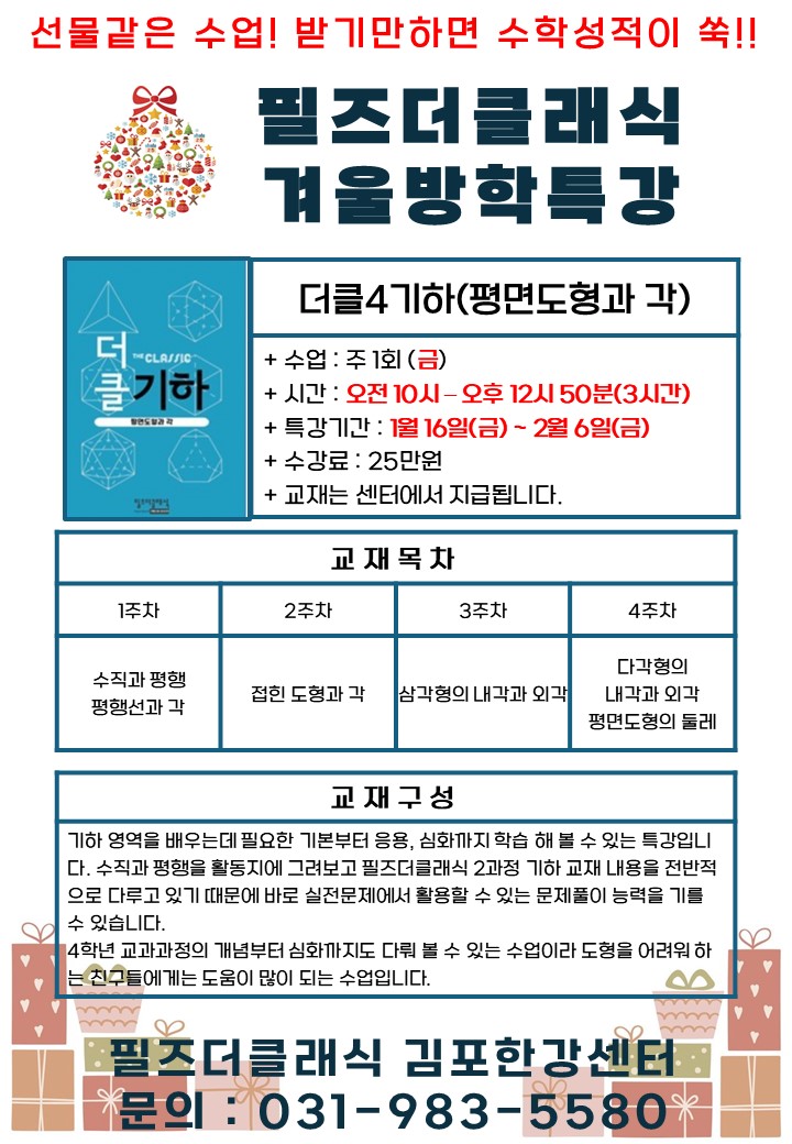 안녕하세요 필즈더클래식 김포한강센터입니다. 며칠 강추위가 계속 되고 있습니다. 감기에 걸리지 않고 건강하게 추위를 이겨내는 필즈친구들 되세요^^ 필즈 방학특강 7번째!! 더클기하 평면도형과 각 입니다. 4학년 이상의 교과개념부터 심화 응용까지 더불어 2과정을 학습하고 있는 친구들에게는 전반적으로 복습과 예습을 아우를 수 있는 기하 특강 입니다. 2,3 학년 친구들에게 추천하는 학습입니다. 방학을 이제 여기저기서 하는 시기입니다. 새해가 되었으니 새로운 마음으로 다음학년을 위해 준비하고 다질 수 있는 방학이 되기를 응원합니다!!! 방학특강 신청 바로가기!! https://form.naver.com/response/T6H8FEvlGfSXoS5N8x9Wbw https:....... <img src="https://blogthumb.pstatic.net/MjAyNjAxMDJfMjUx/MDAxNzY3MzM1NzM5MjIy.HLuK-TJAS76ienYDZA8kxWkK5r7_uKTxl0zSkzxPZegg.4UXhFkCiKuG91t3_oEci8v6ecLx8OLtjqoZhhmWr3UAg.JPEG/%BD%BD%B6%F3%C0%CC%B5%E531.JPG?type=s3" />