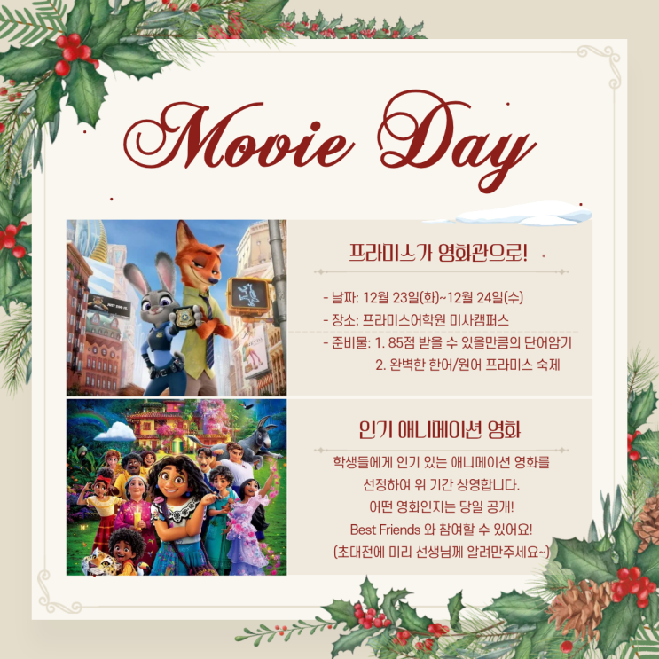 안녕하세요 미사영어학원 프라미스어학원입니다:) 1년동안 숙제, 온라인 독서, 단어시험까지 열심히 따라와준 우리 학생들을 위한 프라미스 선생님들의 작은 선물이었습니다~ 프라미스가 영화관으로! 맛있는 팝콘과 함께!! 1년에 1번! 친구도 초대할 수 있는 기회! 바로 무비데이 입니다~ 프라미스 무비데이 준비물! 1. 완벽한 한어/원어 숙제 2. 완벽한 단어암기 및 시험준비 이 2가지를 모두 완료 한 후, 우리 학생들은 즐거운 무비데이를 진행했습니다~ 2025년에도 열심히 공부한 우리학생들♥ 너무 수고 많았어요~ 2026년에도 열심히 프라미스선생님들과 함께 공부해봅시다!! 초3부터 중3까지 가장 체계적인 관리형 어학원 6번째 직영캠퍼스....... <img src="https://blogthumb.pstatic.net/MjAyNjAxMDZfMjY0/MDAxNzY3Njc5NTIwNTM5.HNyOOaFSJrYS3BH8-pEnlnkV8lvl3XBh2RpmY88RyK4g.7xCjAYKWZIi-hcmeDtrEi-Yahy_hr2THyyLRJENVLvUg.PNG/3.png?type=s3" />
