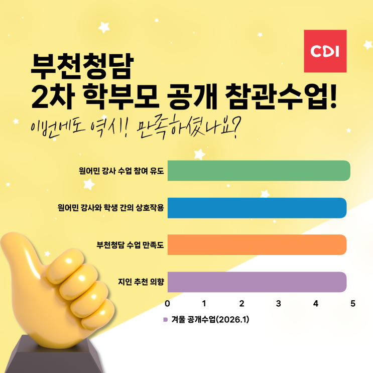 부천청담 2차 학부모 공개 참관수업 후기 “이번에도 역시 만족하셨나요?” 부천청담의 2026년 1월, 2차 학부모 공개 참관수업이 마무리되었습니다. 이번 참관수업은 단순한 ‘보여주기 수업’이 아니라, 아이들이 실제로 어떻게 수업에 참여하고, 어떻게 생각하고, 어떻게 성장하는지 그 과정을 그대로 공개한 자리였습니다. 재원생 학부모님들이 직접 평가! 평균 4.89 / 5점 (총 156명 참여) 참관 후 진행된 설문 결과는 수치로도 분명했습니다. 원어민 강사의 수업 참여 유도 원어민 강사와 학생 간의 실제 상호작용 부천청담 수업 전반에 대한 만족도 지인 추천 의향 모든 항목에서 거의 만점에 가까운 평가를 받았습니다. 결과가 아니....... <img src="https://blogthumb.pstatic.net/MjAyNjAxMDhfMjUz/MDAxNzY3ODc1Mzc1MTcw.R2hawUW8-GmNhtLdd7j_2XNQDbLrkLstK8copAvpAh8g.a_r-2F60JUEYOpjYsTlUosB3lBwjZgwT3qoo_QoZKvsg.PNG/%BA%B9%BB%E7%BA%BB_%BF%F8%BA%BB_%BB%E7%C0%CC%C1%EE-%C0%CC%BA%A5%C6%AE_%284%29.png?type=s3" />