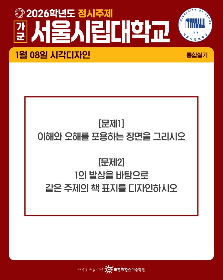 안녕하세요️ 미대입시전문 바우하우스 미술학원입니다 1월 8일, 서울시립대 시각디자인 정시 실기 시험이 치러졌는데요, 시각디자인 실기시험에서 출제된 문제와 제시물, 작년과 올해 서울시립대 시각디자인학과 정시 경쟁률까지 한 번에 알려드릴게요 2026학년도 서울시립대 미대 정시 시각디자인 주제 문제1 이해와 오해를 포용하는 장면을 그리시오 문제2 1의 발상을 바탕으로 같은 주제의 책 표지를 디자인하시오 2026학년도 서울시립대 시각디자인 정시 경쟁률 26학년도 서울시립대학교 디자인학과의 정시 경쟁률입니다✅ 이상으로 2026학년도 서울시립대 시각디자인 정시 모집의 실기문제와 경쟁률을 전해드렸습....... <img src="https://blogthumb.pstatic.net/MjAyNjAxMDlfMTc4/MDAxNzY3OTI1NTA4NTc2.yr2ajeVpL_eVtTpfZw4x46nsXEIk2rCg2tJjVP2p7oUg.MhT5uiPMkXOrEYAW5ElXWXhZMnRrmwK3pVxzrOkh79sg.JPEG/2026%C7%D0%B3%E2%B5%B5_%C1%A4%BD%C3%B9%AE%C1%A6_%BC%AD%BF%EF%BD%C3%B8%B3%B4%EB_%BD%C3%B0%A2%B5%F0%C0%DA%C0%CE.jpg?type=s3" />