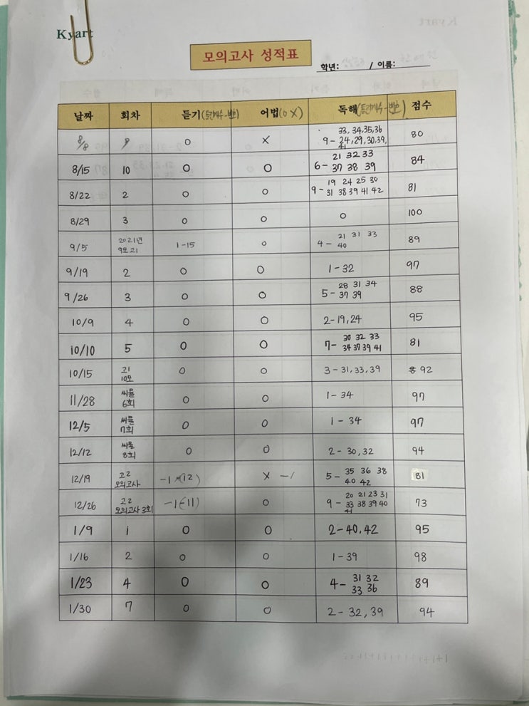 매주 모의고사로 실력을 만든다 | 키아트영어 실전 영어 훈련 영어는 단기간에 실력이 만들어지지 않습니다. 특히 고등 영어와 수능 영어는 실전 시험 경험과 정확한 분석이 반복되어야 합니다. 그래서 키아트영어에서는 아이들이 시험에서 흔들리지 않도록 매주 1회 모의고사 수업을 진행하고 있습니다. ⸻ 2️⃣ 키아트영어 모의고사 시스템 키아트영어에서는 레벨별 시뮬레이션 모의고사를 실시합니다. 단순히 문제를 풀어보는 테스트가 아니라 실제 시험과 같은 방식으로 진행되는 실전 훈련 수업입니다. 시험 전에는 각 레벨에 맞는 전략 코칭을 진행한 후 시험에 들어갑니다. ✔ 어떤 문제에서 시간을 줄여야 하는지 ✔ 어떤 유형에서 실수....... <img src="https://blogthumb.pstatic.net/MjAyNjAzMDdfMTgz/MDAxNzcyODgxNTE1MTg2.wv7rc3QieN5f12eHnJCpUEZtooHHlzF9AFlsnN0DCKkg.TI4PFB5BWeNZuYfswdAs2EBtnhi9_zzM6oTNeuVRZ6sg.JPEG/IMG%A3%DF9367.JPG?type=s3" />