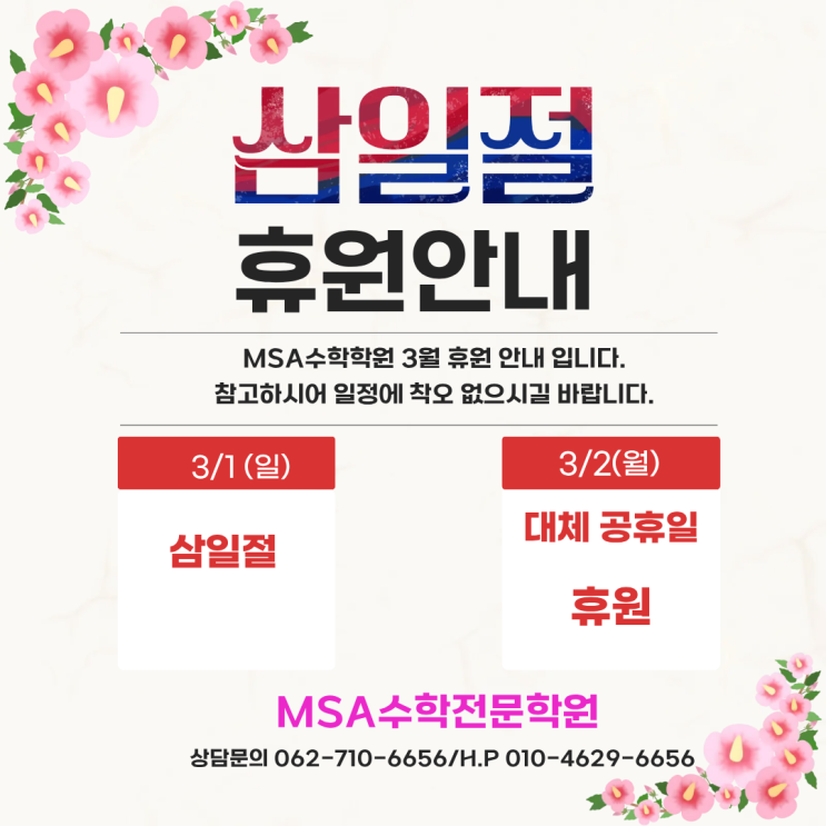 안녕하세요, MSA수학학원입니다. 3월 학원 운영 일정 안내드립니다. 학부모님과 학생 여러분께서는 일정 참고하시어 착오 없으시길 바랍니다. ✔ 3월 2일(월) 대체공휴일 → MSA 휴원 아이들이 계속 발전해 나갈수 있도록 재원생 한명한명 관심을 갖으며 사랑으로 지도하는 MSA 수학학원이 되겠습니다. 감사합니다. <img src="https://blogthumb.pstatic.net/MjAyNjAyMjRfMjI1/MDAxNzcxOTI1NTQ5Mjkz.8OE1GuqnRRRu-7aYsNNlnWmUopgaNHD2TGgandAYv60g.rkPHyDGqalg55RZkx8COZQcgW3eXzaZQ9n3uDhNFLiMg.PNG/1.png?type=s3" />