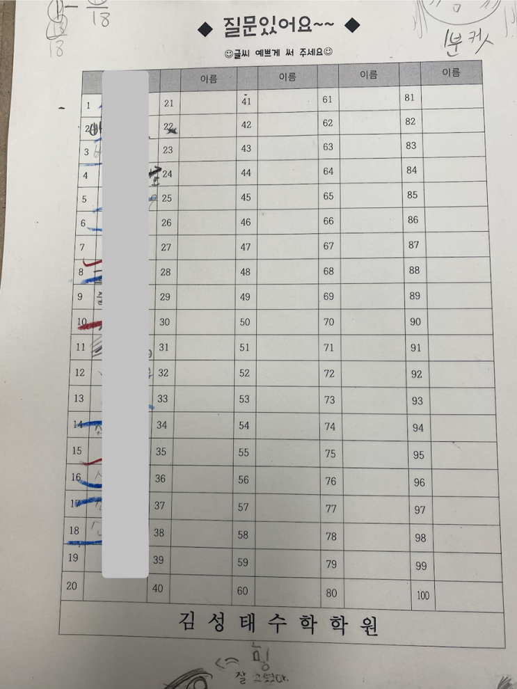 질문리스트에 이름을 써요 필요시 개념을 다시 짚어주고 상세한 설명과 꼼꼼한 피드백이 들어갑니다 설명듣고 제자리로 돌아가 다시 생각하며 풀어야 해요 개인별 맞춤학습을 진행합니다. 진도도 획일적이지 않습니다. 어려워하는 부분은 개개인마다 다르거든요~ 다른 친구들때문에 기다릴 필요도 없고 억지로 끌려갈 필요도 없어요 사고력이 좋고 즐기는 학생들은 그 속도로 수학이 넘 어려운 학생들은 또 그 속도대로 각자의 걸음에 맞는 나만의 수학을 공부해요 예를 들어 중1 과정 생각보다 양수 음수 계산이 잘 안됩니다 그럴때는 맞춤으로 연산 집중훈련이 들어가지요 다년간 수많은 학생들을 가르치며 집약된 노하우가 풍부합니다....... <img src="https://blogthumb.pstatic.net/MjAyNjAyMjRfMjg0/MDAxNzcxOTQxODUxNjQw.bUEg_iKmSH4J7qwpLqcqtHJ992bT0h-Eq0npNM-zbCAg._ttmyJ7YTiEgpTq19c2daSpOhUHjFTdg8O-mqznyUeMg.PNG/IMG%A3%DF7826.png?type=s3" />