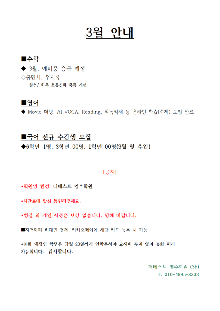 더베스트 영수학원 3월 안내