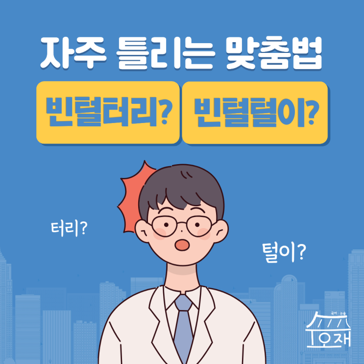 안녕하세요, 부천 수오재 국어학원입니다! 우리가 일상에서 정말 자주 쓰는 단어지만, 막상 쓰려고 하면 멈칫하게 되는 단어들이 있지요, 오늘은 그 중 하나인 '빈털터리/빈털털이'에 대해서 이야기 해보도록 하겠습니다. 적잖은 액수의 퇴직금은 받았지만 고향에 계시는 아버지의 위 수술 비용을 대고 나머지로 몇 달 생활하고 나니 빈털터리가 돼 버렸다. '빈털터리'가 올바른 표기입니다. 빈-털터리 명사 1. 재산을 다 없애고 아무것도 가진 것이 없는 가난뱅이가 된 사람. '빈털터리'는 아무것도 가진 게 없는 상태를 뜻하는 말인데요, '빈털털이'는 아예 사전에 없는 비표준어로 어떤 상황에서도 &....... <img src="https://blogthumb.pstatic.net/MjAyNjAyMjNfMTM4/MDAxNzcxODE1ODgzOTM0.aGeCfgu0LEI_gpHFcXNfzlYBhKYi61Rys-DKow5Wh2kg.C6bmjbNF3WJ9U5zx4iIzIF6I-19oW8AmajD_-qSYtXcg.PNG/%C1%A6%B8%F1%C0%BB_%C0%D4%B7%C2%C7%D8%C1%D6%BC%BC%BF%E4..png?type=s3" />