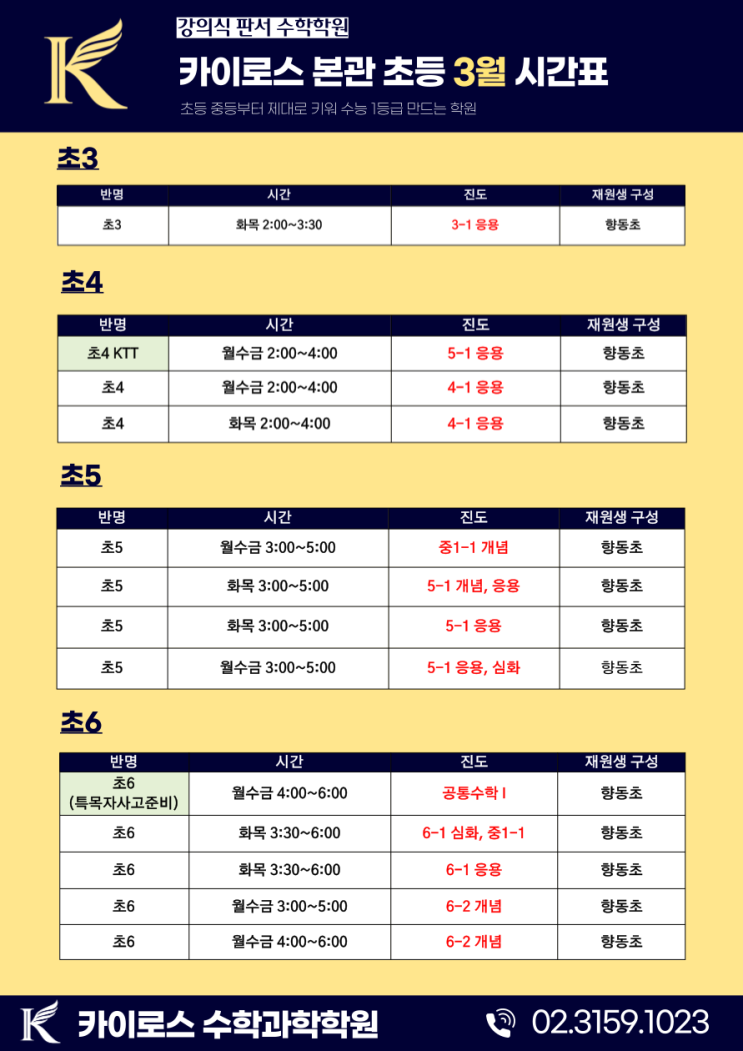 ▶향동수학학원 카이로스 수학과학◀ 향동초관 / 숲내초관 3월 정규 시간표 및 재원생 혜택 안내