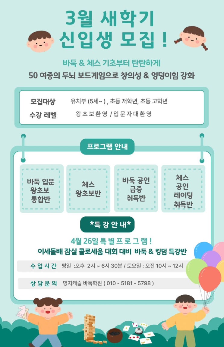 수천 년의 지혜, 우리 아이 두뇌로 이어집니다 3월 신학기 바둑 & 체스 신입생 모집 요즘 부모님들 사이에서 “우리 아이 집중력이 너무 부족해요” “생각하는 힘을 키워주고 싶어요” 라는 고민이 많습니다. 그래서일까요? 최근 다시 주목받는 교육이 있습니다. 바로 바둑과 체스입니다. ⸻ 바둑은 왜 특별할까요? 바둑은 단순한 게임이 아닙니다. 무려 4000년 이상의 역사를 가진 인류 최고의 두뇌 스포츠입니다. 중국 황제들이 왕자들의 교육을 위해 만들었다는 이야기가 전해지고, 우리나라에서도 예로부터 ✔ 집중력 ✔ 인내 ✔ 전략적 사고 를 기르는 필수 교양으로 여겨졌습니다. 과거 선비들이 바둑을 통해 마음을 다스리....... <img src="https://blogthumb.pstatic.net/MjAyNjAyMjVfMjYz/MDAxNzcyMDMwMTQ4Mjc1.zsfZKc6-3aU0VvBJkW_qSTjPUqMos8UswxT22ORve_kg.hca6VNkEN5C6s-HJX1cV_ceZRmQpPjUk9r7mTE4pZ_Eg.JPEG/IMG%A3%DF2893.JPG?type=s3" />