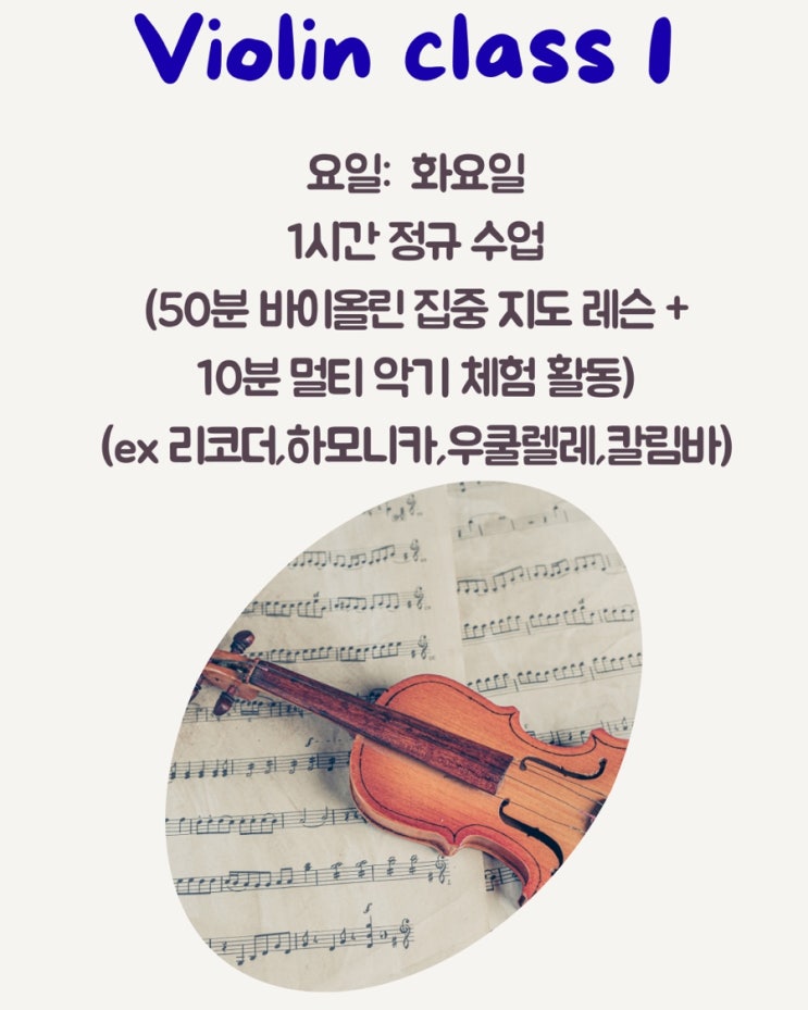바이올린 레슨 안내 ✔ 1:1 집중 레슨 50분 정규 수업 – 50분 바이올린 집중 지도 – 10분 멀티 악기 체험 활동 (리코더 · 하모니카 · 우쿨렐레) 한 가지 악기만 배우는 수업이 아닌, 음악적 감각과 표현력을 함께 키우는 수업입니다. ⸻ ✔ 30분 레슨 선택 가능 – 짧고 집중도 높은 개인 레슨 – 기초 다지기 및 취미반 추천 아이의 성향과 집중력에 맞춰 수업 시간을 선택하실 수 있습니다. 문의☎️ 010 7531 2344 https://www.instagram.com/hjewha_piano?igsh=bjdwbDV1N2hld3lk&utm_source=qr <img src="https://blogthumb.pstatic.net/MjAyNjAyMjVfNDYg/MDAxNzcxOTkyMDA3MTk3.9JhC8_CiNqL3iXu12E7W_MZs0DkBnhV7JmoJ1mCqt-Ug.oZwZh_Fw031IsiLFFObx1zwnefAGJ9VEi_2W__ZXRo4g.JPEG/IMG%A3%DF2160.jpg?type=s3" />