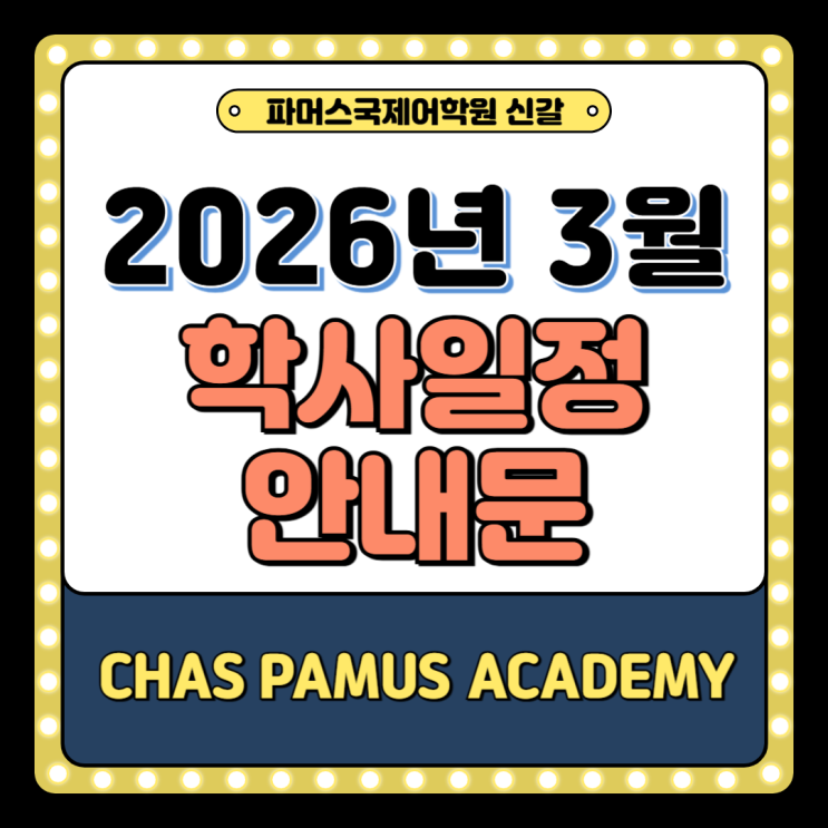 2026년 3월 차스파머스 신갈브랜치 학사일정 안내 신갈동 영어학원|파머스국제어학원 차스신갈브랜치 안녕하세요 아이의 성장 과정을 함께 만들어가는 신갈동 영어학원 파머스국제어학원 차스신갈브랜치입니다. 새 학년이 시작되는 3월, 아이들이 안정적으로 적응하고 학습 흐름을 잡을 수 있도록 2026년 3월 학사일정을 안내드립니다. 3월 주요 일정 한눈에 보기 ✔ 3/3(화) 신규반 개강 ✔ 3/6(금) 3월 기본반 개강 ✔ 3/10 학부모 설명회 & 체험수업 ✔ 3/13 그릿마스터 시상 ✔ 3/23~ 1:1 신학기 대면 상담주간 ✔ 3/30 단어인증제 진행 새 학기를 맞아 아이들의 학습 방향을 점검하고 목표를 세우는 중요한 시기입니다....... <img src="https://blogthumb.pstatic.net/MjAyNjAyMjNfMTkg/MDAxNzcxODM3ODM2MzQz.RZmbOYuSQe8MhfCZvnPOavOOBZghN8mNNLp_IFo6csMg.B9zc1lYGzqO69k6vEQDsNcqCCSdrKT5-1b5GAcC1ihsg.PNG/%BA%ED%B7%CE%B1%D7%BD%E6%B3%D7%C0%CF-003_%286%29.png?type=s3" />