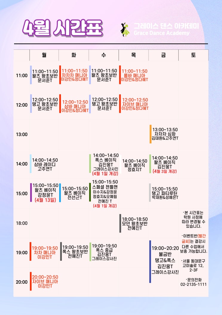 그레이스 4월 시간표 안내드려요~! <불금반 / 젠틀맨반을 제외한 단체반은 언제든 수강 가능합니다> 초보자분들을 위한 단체반부터 베이직 위주 수업 단체반, 중급반, 프로암 상급반 까지 다양한 단체반 수업 진행하고 있습니다! 이외에도 개인레슨/소그룹 수업/입시/선수반 등 궁금하신 점은 편하게 문의 주세요!! 수업 문의 : 02-2135-1111 카카오톡 : 그레이스댄스아카데미 <img src="https://blogthumb.pstatic.net/MjAyNjAzMjNfNTgg/MDAxNzc0MjQ0MDk2NDIy.MD8p6YewrxWs3Gev9K8Pwa6B5qO3NQRHJOhsNayUHHgg.1Mw_vlIUBV23nyDaFkLv8nX6gmGlLYDeUKd_FivaUnIg.JPEG/2026_4%BF%F9_%B4%DC%C3%BC.jpg?type=s3" />