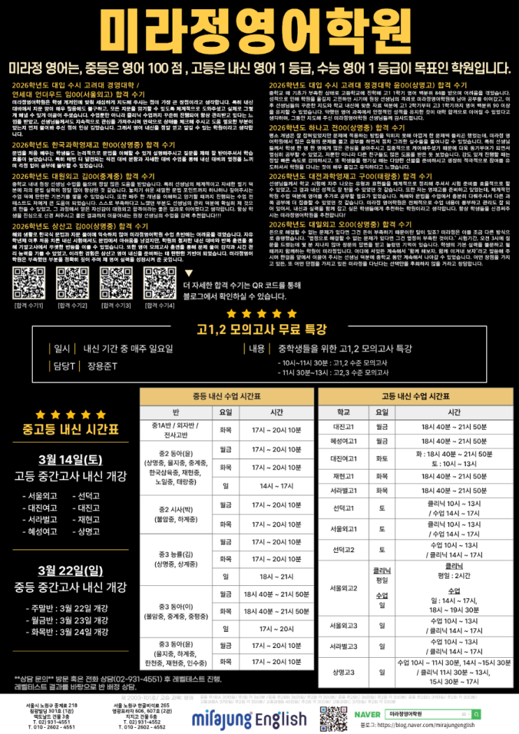 [중계 미라정영어학원]2026년 1학기 중간고사대비 시간표