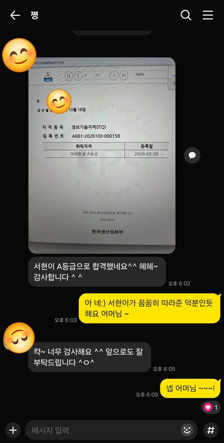 은평구 컴퓨터학원 이지코딩 자격증 합격 소식과 학부모님의 따뜻한 후기
