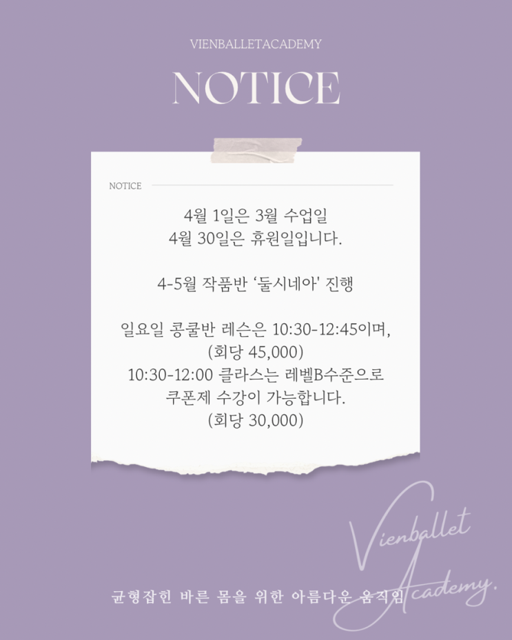 비엔발레 4월의 전체 일정입니다. ️ 계획적인 수강을 위해 수업일과 휴원일을 미리 확인해 주세요. ▪️ 주요 일정 4/1(수) : 3월 보강 수업 진행 4/30(목) : 학원 휴원일 ▪️ 4월 등록 기간 기존 회원 : 3/20 ~ 3/28 신규 회원 : 3/24 ~ 3/28 "비엔발레는 수강생분들의 몰입도를 위해 정규 클래스 중심으로 운영됩니다." 상담 및 문의 카카오톡 : vienballet 전화 : 010.3252.4512 균형잡힌 바른 몸을 위한 아름다운 움직임, 비엔발레아카데미 #은평뉴타운발레 #은평뉴타운성인발레 #은평뉴타운발레학원 #은평뉴타운초등발레 #은평뉴타운유아발레 #구파발성인발레 #구파발발레 #구파발발레학원 #구파발초등발레 #구파발유....... <img src="https://blogthumb.pstatic.net/MjAyNjAzMThfMTU2/MDAxNzczODIwNzYwNzgz.NK2-bKQJ-vapBwgdAHtvjyflfnx6Bb-0G4wAg5Ue9rYg.6kwfTBVrtLdVo0JFBvG7oyXmDRCeR-a9wFuvRbnV_VMg.PNG/IMG%A3%DF6511.PNG?type=s3" />