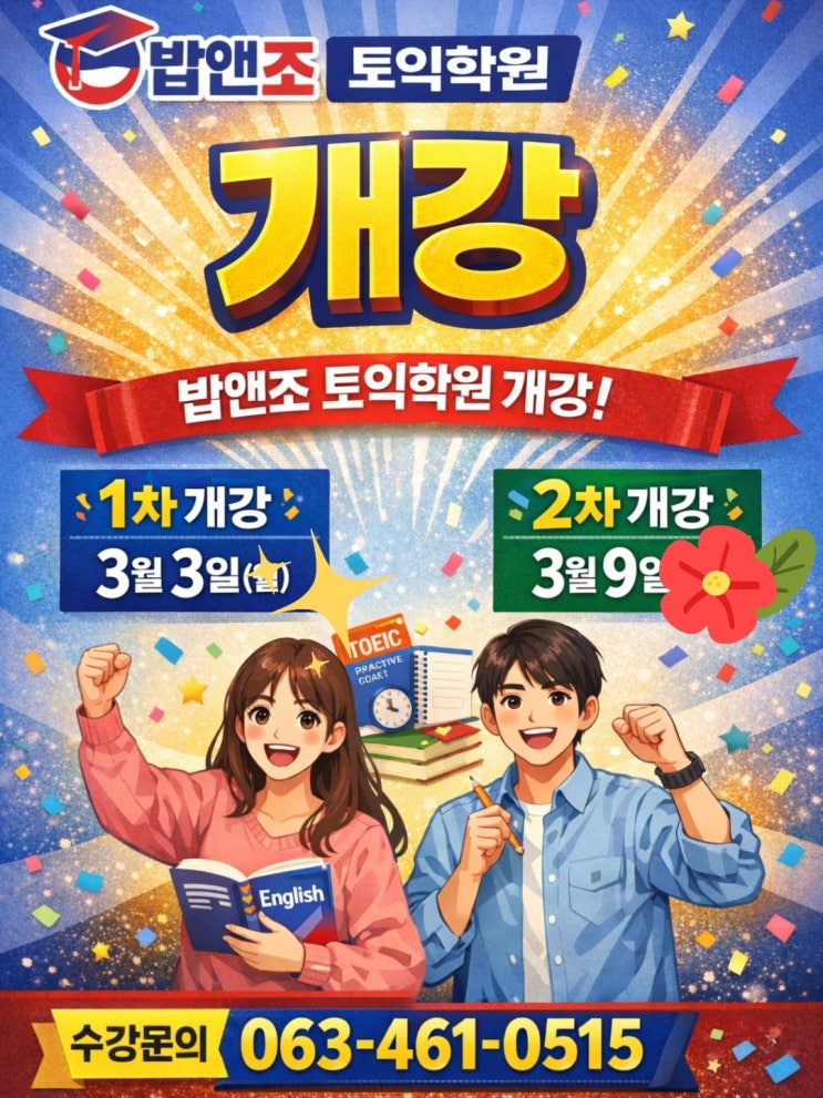 2026년 3월 토익특강 개강! 개강일: 1차 3월 3일 /2차 3월 9일 군산토익 1위 자신감 3월은 점수 만드는 달입니다. 이번에 안 하면 또 미루게 됩니다. 망설이면 또 한 달 갑니다. 이번에는 결과로 증명하세요. 토익 점수를 단기간에 끌어올릴 수 있는 최고의 기회입니다. 토익은 전략이 곧 점수입니다. 기초부터 실전까지 점수로 증명하는 토익 전문 학원 1번-200번까지 예상 답안을 미리 알려주는 최고의 적중 토익 군산 전설 토익. 역사가 증명하고 수강생 입소문으로 유명한 밥앤조토익학원에서 당신의 꿈을 이루세요! 봄 채용 시즌 시작 졸업요건 마감 임박 상반기 준비 지금이 적기 이런 분들, 지금 바로 등록하세요! 1, 이번 시험에서 반드....... <img src="https://blogthumb.pstatic.net/MjAyNjAyMjZfMTQ1/MDAxNzcyMTE2MDM1NjU5.wx6RP0T0YFmykE_EFOnnuuNNi6zrAqzSowTFPGhjpBYg.PdRz8rbfJoogiyc8LC31lAnlkiskk3pKpDpjw0iiaBcg.JPEG/Screenshot_20260224_154753_ChatGPT.jpg?type=s3" />
