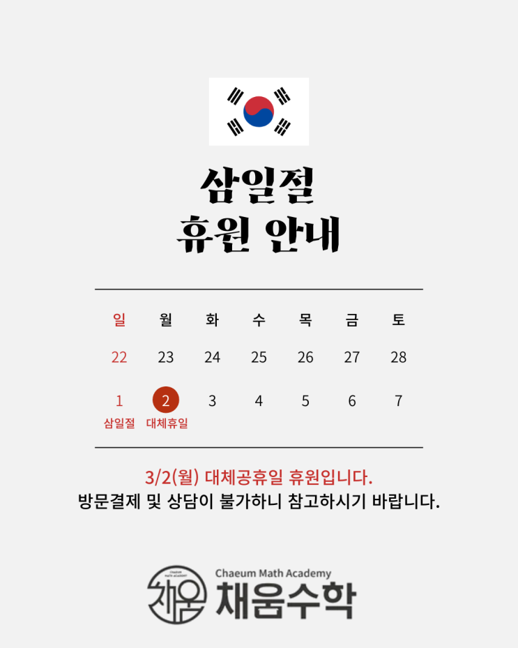 안녕하세요 마포채움수학과학입니다:) 다가오는 삼일절 연휴, 휴원 안내 드립니다. 3/2(월) 대체공휴일 휴원 3/2(월) 삼일절 대체공휴일 휴원입니다. 방문결제 및 상담이 불가하니 참고하시기 바랍니다. 문의) 전화 02-6449-4501 문자전용 010-6210-4501 <img src="https://blogthumb.pstatic.net/MjAyNjAyMjNfMTg0/MDAxNzcxODQ5OTEyODg0.Q8We2kciwb_dSpiVOZQbyoaEFXtnlj_48Jp4_D4td-0g.h1W1f_qnl-_XdyT3zEEygTmXySWZD_lK_npWAsI7b9sg.PNG/%BB%EF%C0%CF%C0%FD_%C8%DE%BF%F8_%BE%C8%B3%BB.png?type=s3" />