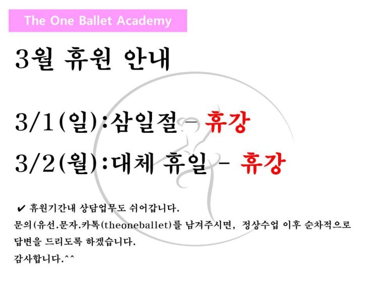 안녕하세요 더원발레아카데미입니다 요즘 낮 기온이 오르면서 날씨가 조금 포근해진 것 같아요! 3월은 따듯하게 보낼 수 있길 빌어봅니다,, 오늘은 3월 휴원과 등록을 안내해드리겠습니다:) 삼일절과 대체 휴일인 3/1(일)~3/2(월)은 휴강입니다! 이 기간에는 상담업무도 진행되지 않습니다! 3/3(화)부터 순차적으로 답변해드리니 참고해 주세요:) 삼일절 휴강으로, 휴식과 의미를 되새기는 날이 되길 바랍니다. 현재 성인발레, 초등/키즈발레 수업의 3월 등록을 받고 있습니다. ❗ 현재 마감된 수업이 있으며, 여석이 생길 시 순차적으로 연락 드리고 있습니다. 날씨도 선선해서 운동하기 너무 좋아졌는데요~ 발레로 다시 건강하고....... <img src="https://blogthumb.pstatic.net/MjAyNjAyMjVfNSAg/MDAxNzcyMDE3OTY5Njc3.09lNeMtwOoEcqjZPGW99GtBMQcOCbBAIcEby9BSuGL8g.Uo2X5f3x8IIgrbniK9WZD6SbTS3ME27gx5HK3nfur84g.JPEG/KakaoTalk_20260225_195046679.jpg?type=s3" />