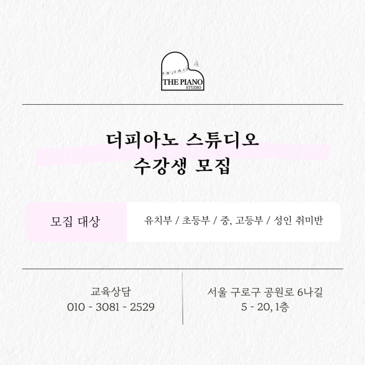 더피아노와 함께해요 유치부부터 성인 취미반까지 피아노 전공 원장 직강 1:1 레슨. 지금 등록하시면 작지만 예쁜 선물을 무료 제공해드립니다 미래초등학교 도보 3분 거리, 신도림역 3번 출구에서 가까워요! 우리 아이 첫 피아노, 성인분들 더피아노 스튜디오 음악교습소에서 함께해요❤️ 교육 상담 문의 : 010 - 3081 - 2529 위치 : 서울 구로구 공원로 6나길 5-20, 1층 <img src="https://blogthumb.pstatic.net/MjAyNjAzMDRfMTEz/MDAxNzcyNTk2NDkwODgw.iLQewmlefFT0oHaOW3uBKmF59cHVJSUxxUPywhTPwnAg.rAV7hQd8pnEkH5cbWbDS5kzm8umU3oLU_7IDBeXfl4Qg.PNG/1772596399919.png?type=s3" />