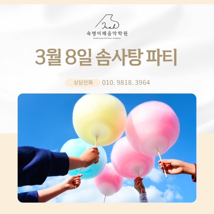 저희 학원에서는 음악처럼 부드러우면서도 솜사탕처럼 가벼운 새학기를 시작하게 하기 위해서 솜사탕 파티를 개최하는데요. 지금부터 자세히 행사에 대해서 안내를 드리도록 하겠습니다! [ 솜사탕 파티 행 사 안 내] *일시: 3월 6일(금) 오후 12:30 - 4:30 *장소: 성광빌딩 파리바게트 앞 (서울특별시 구로구 신도림로 19길 7 성광빌딩) *참여 방법: 전단지 속 솜사탕 쿠폰 지참 필수 *저학년 친구들은 보호자와 함께 방문 부탁드립니다. *참여 안내: 솜사탕은 전단지에 있는 솜사탕 쿠폰 지참 시 제공됩니다. ((꼭 쿠폰을 챙겨서 방문해 주세요.)) ** 아이들이 즐거운 기억으로 새 학기를 시작할 수 있도록 많은 관심과 참여 부탁드립니다 ** 신....... <img src="https://blogthumb.pstatic.net/MjAyNjAzMDRfOTIg/MDAxNzcyNjI1NjE2ODkz.Ejq9mPD9_w0QO1y5RADPb902Mmhq2j9SH4rpyPD4imAg.QwjyIzJjbXbXYt5ujYdW-SvkFZjJdWwDxDbYpulOkNYg.JPEG/000.jpg?type=s3" />