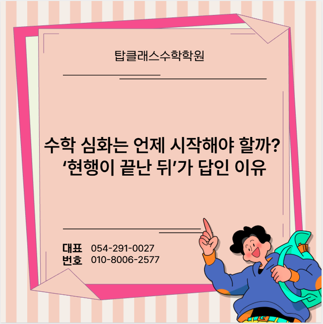안녕하세요. 문덕중등수학학원인 탑클래스수학학원입니다. 수학을 공부하다 보면 많은 학부모님들께서 한 번쯤 고민하시는 질문이 있습니다. “우리 아이, 심화 문제를 지금부터 시작해야 할까요?” 심화 학습은 분명 중요합니다. 그러나 시기와 순서가 맞지 않으면 오히려 학습에 부담을 주고 자신감을 떨어뜨릴 수 있습니다. 수학 심화는 빠르게 시작하는 것이 중요한 것이 아니라, ‘제대로 준비된 뒤’ 시작하는 것이 핵심입니다. 수학은 누적 구조를 가진 과목입니다. 현재 배우는 단원이 정확히 이해되지 않은 상태에서 심화 문제를 풀기 시작하면, 문제 풀이 과정이 논리적 사고가 아니라 ‘감’에 의존하게 됩니다. 개념이 흔들린 상태에....... <img src="https://blogthumb.pstatic.net/MjAyNjAyMjNfMTQ3/MDAxNzcxODE2NTEyMDY5.B6BOBIrMIi2vsPiiQhqWZL-LH7N5nGOHJFT2GRIh6Ewg.TD7GE89dGlzOWd0LmsnxyIQiHyzD-EIBp8F6yzgcZCMg.PNG/image.png?type=s3" />
