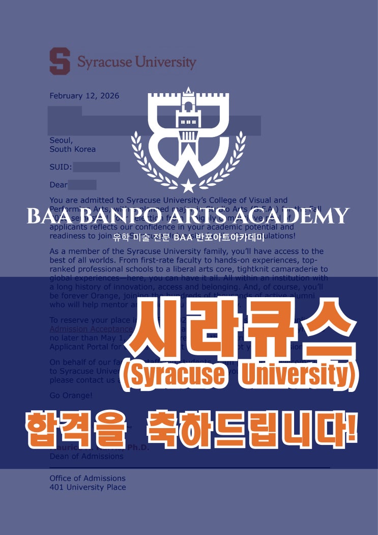시라큐스 합격! 미술과로 당당히 합격한 오** 학생, 진심으로 축하합니다! 꾸준히 쌓아온 작업과 포트폴리오의 힘이 결국 결과로 이어졌습니다. Syracuse University 는 뉴욕주에 위치한 명문 사립대로, 특히 College of Visual and Performing Arts가 강한 학교입니다. 실기 중심 커리큘럼이 탄탄하고, 교수진과의 밀도 높은 피드백, 뉴욕 아트씬과의 연결성, 인턴십 기회가 뛰어난 것이 큰 장점입니다. 전통과 네트워크가 강한 학교인 만큼 졸업 이후 진로 확장성도 매우 좋습니다. 올해도 UC Berkeley 합격! 양** 학생, 진심으로 축하합니다. 비교적 이른 시기에 합격 소식을 받아 더 의미 있는 결과입니다. 처음부터 꾸....... <img src="https://blogthumb.pstatic.net/MjAyNjAzMDlfMTkx/MDAxNzczMDQyMzk3OTAy.nci_Zmd97r4nopYoYKfznigJQB7i2RK1SRYcIyoRQHEg.sFmF9-O37r3wcIbXeKJ-nXW49VnhYzBaVwb3_6o0GsEg.JPEG/baa%C7%D5%B0%DD%BD%C3%B6%F3%C5%A5%BD%BA-01.jpg?type=s3" />